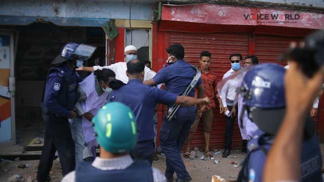পুলিশের বাঁধা উপেক্ষা করে শেষ মুহুর্তেও নিজের দোকান রক্ষা করার চেষ্টা করে ব্যবসায়ীরা। ছবি- আয়াছুল সিফাত
