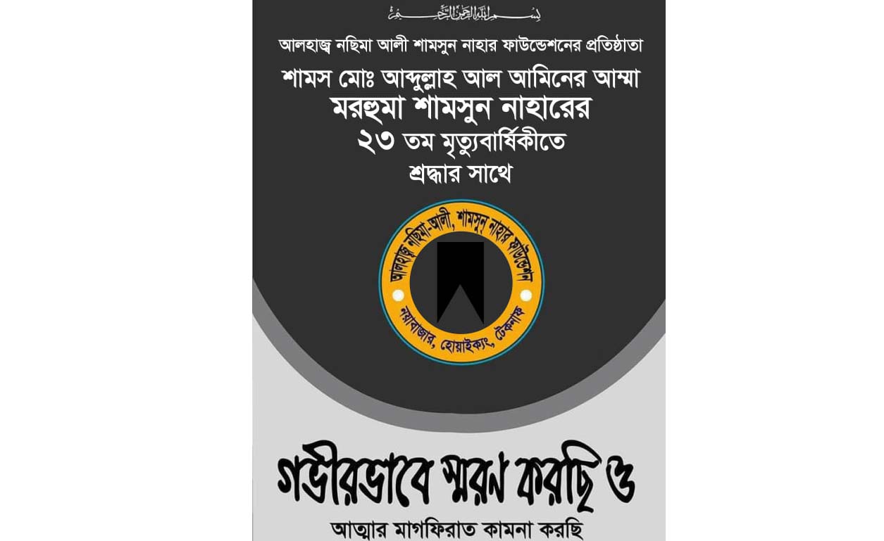 প্রেস বিজ্ঞপ্তি কক্সবাজার জেলা চিংড়ি খামার গ্রুফ এর সাধারণ সম্পাদক ও বাহরুল উলুম দাখিল মাদ্রাসা পরিচালনা কমিটির সাবেক সভাপতি মোঃ নুরুল আমিনের সহধর্মীনি মরহুমা শামসুন নাহারের ২৩ তম মৃত্যু বার্ষিকী